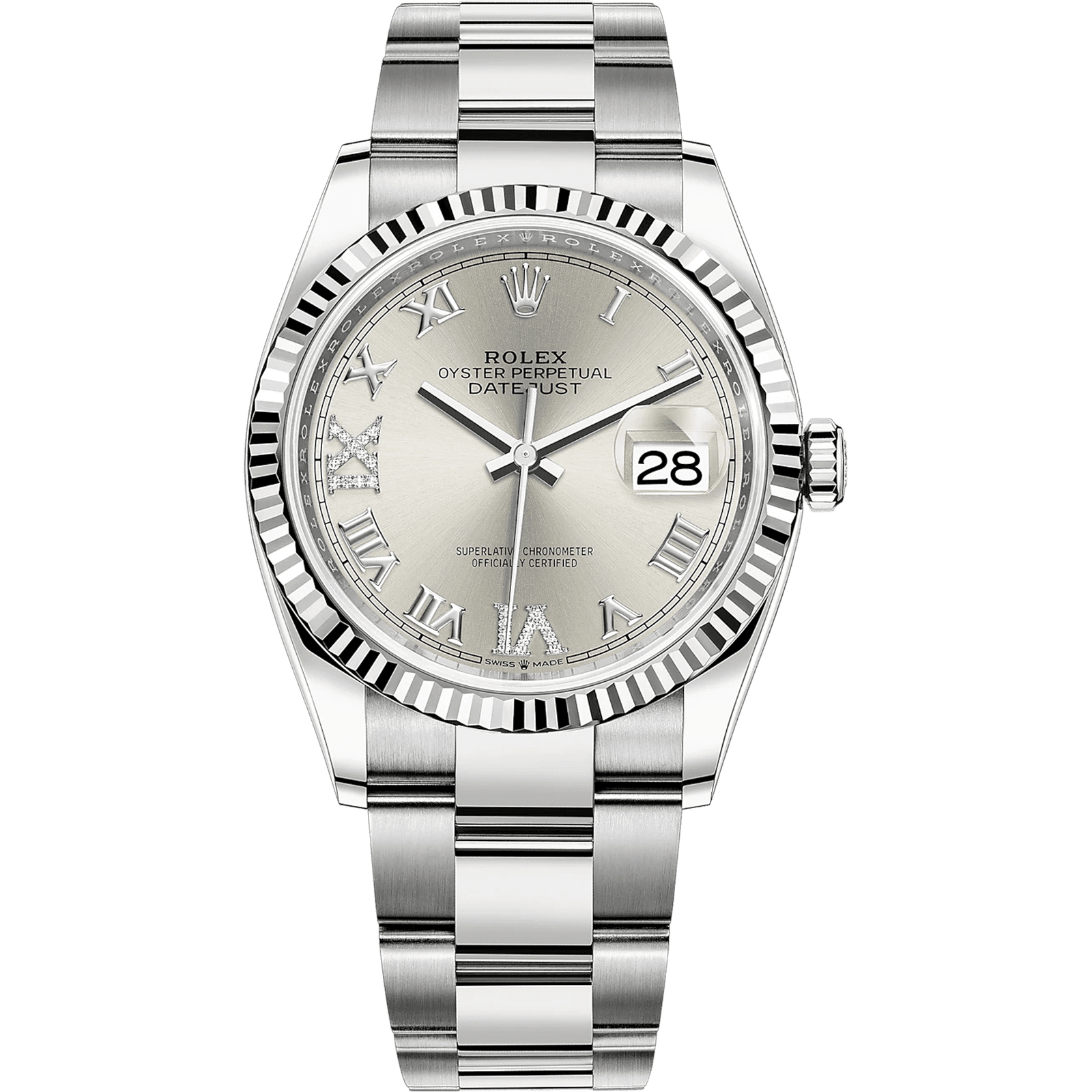 Silver with Roman diamond numeral at 6 and 9.
